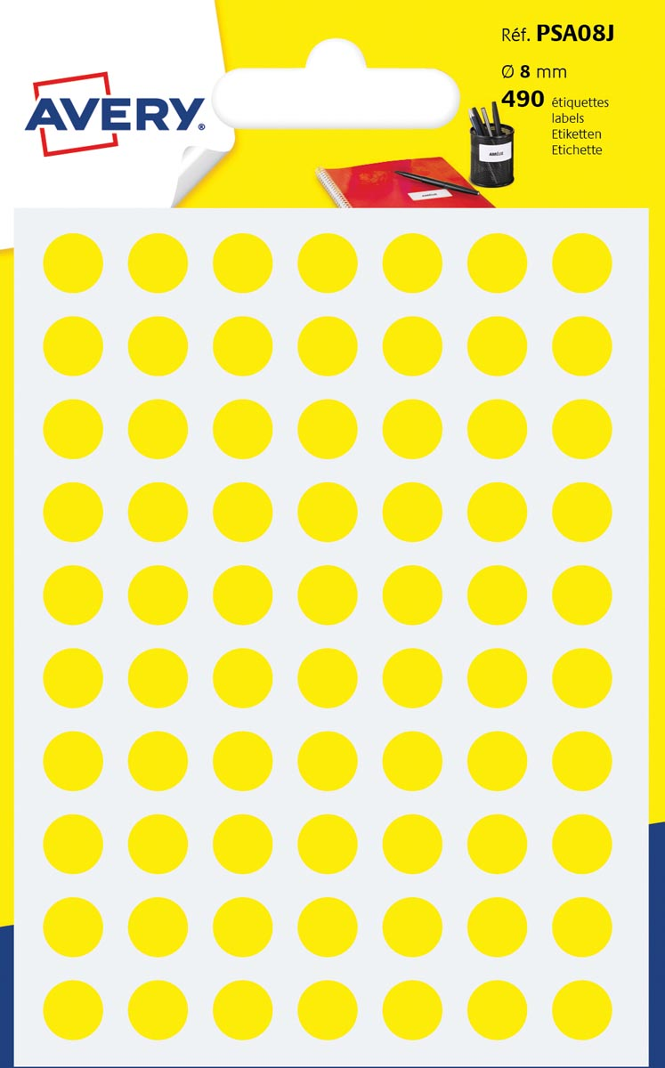 Avery PSA08J ronde markeringsetiketten, diameter 8 mm, blister van 490 stuks, geel