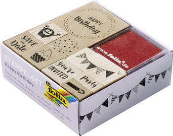 stempelset Happy Birthday met foliemotief, van hout, 11 stuks