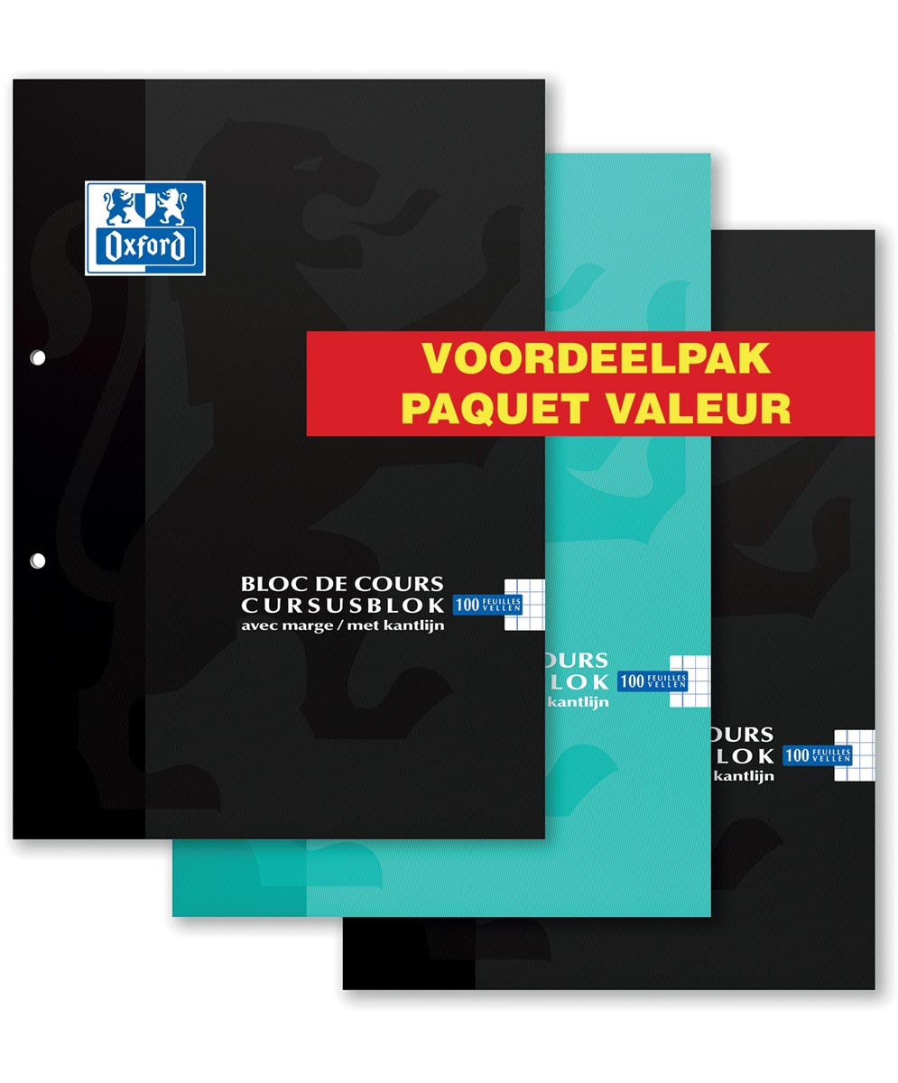 Oxford cursusblok voordeelpak van 3 stuks, geassorteerde kleuren, ft A4, 100 vel, geruit 5 mm